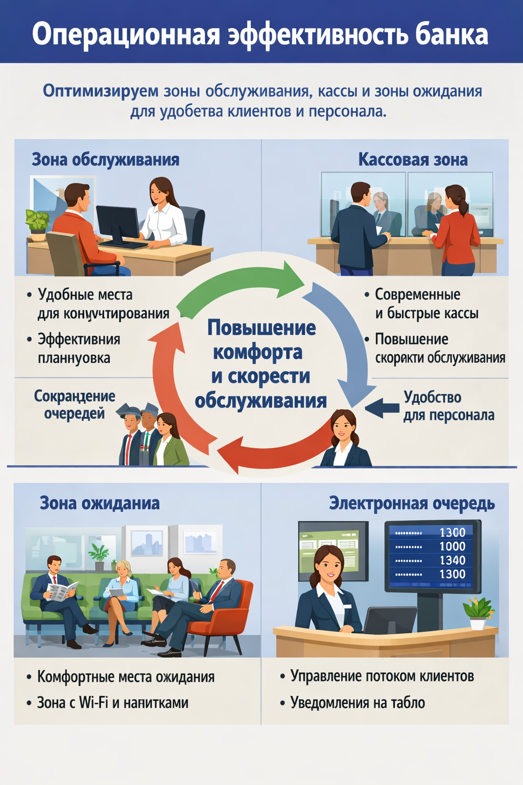 Оптимизируем зоны обслуживания, кассы и зоны ожидания для удобства клиентов и персонала.