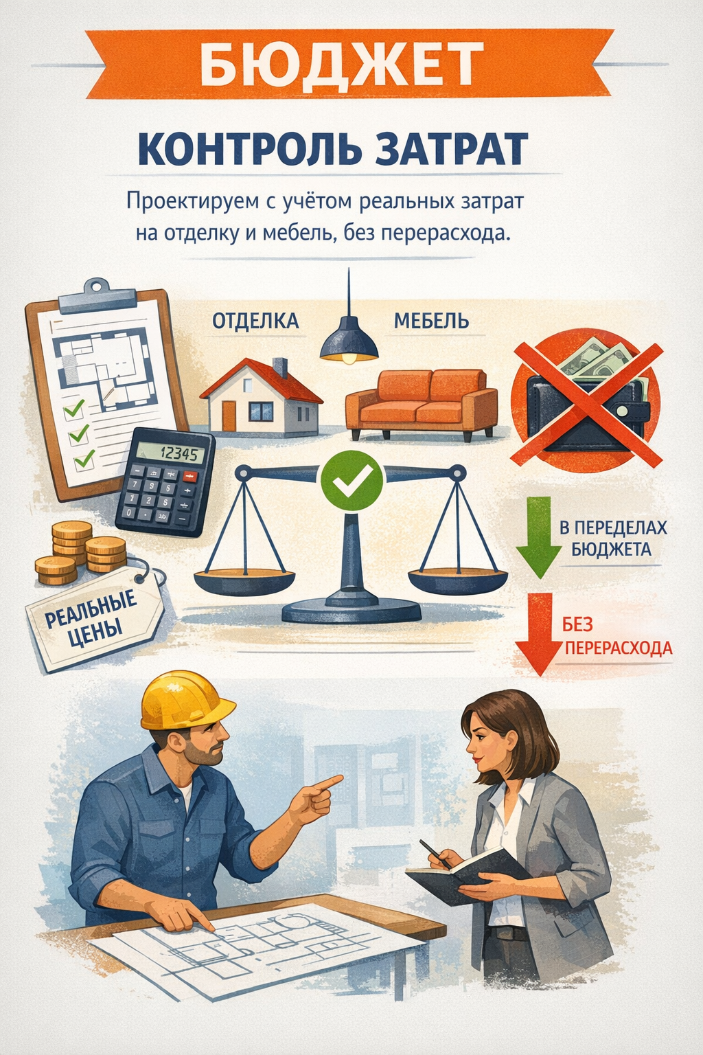 Проектируем с учётом реальных затрат на отделку и мебель, без перерасхода.