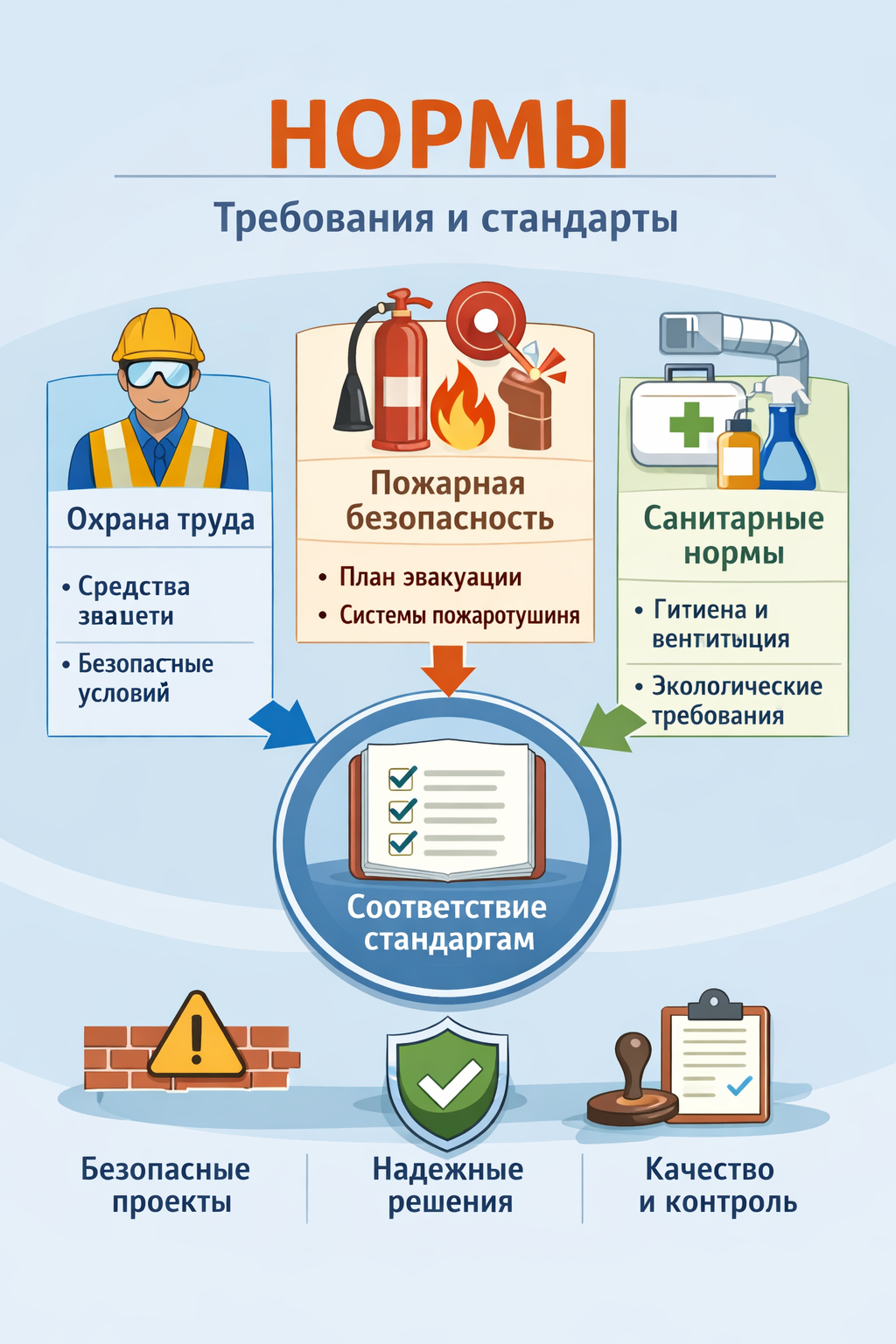 Учитываем требования охраны труда, пожарной безопасности и санитарные нормы.