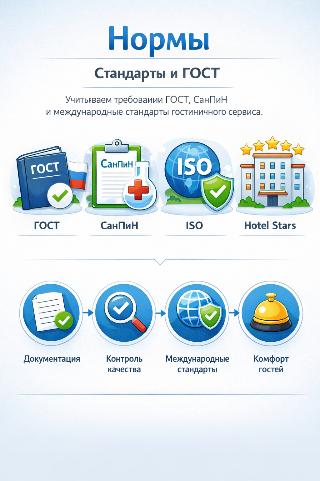 Учитываем требования ГОСТ, СанПиН и международные стандарты гостиничного сервиса.