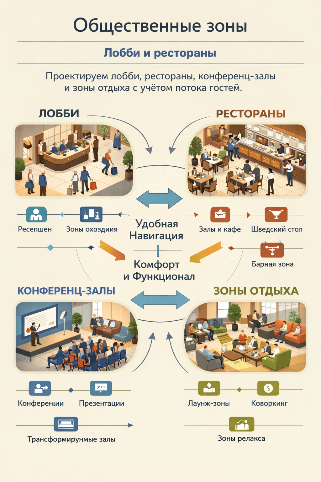 Проектируем лобби, рестораны, конференц-залы и зоны отдыха с учётом потока гостей.